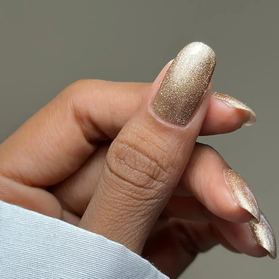 Spritz is een betoverende goudkleurige shimmer die pure luxe uitstraalt. Deze schitterende tint is doordrenkt met fijne reflecterende deeltjes die het licht prachtig vangen en je nagels een vloeibare champagneglow geven.